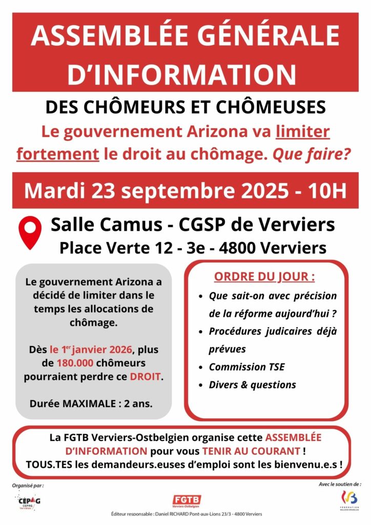 Assemblée Générale d’information à destination des chômeurs et des chômeuses. Que faire face à la limitation dans les temps des allocations de chômage ? Pour des éléments de réponse, RDV le 23 septembre 2025 à 10H – Place Verte 12, salle Camus – locaux de la CGSP de Verviers. Tous les demandeurs d’emploi et toutes les demandeuses d’emploi y sont les bienvenu.e.s ! ORDRE DU JOUR : – Que sait-on avec précision de la réforme aujourd’hui ? – Procédures judiciaires déjà prévues. – Commission TSE. – Divers et questions.